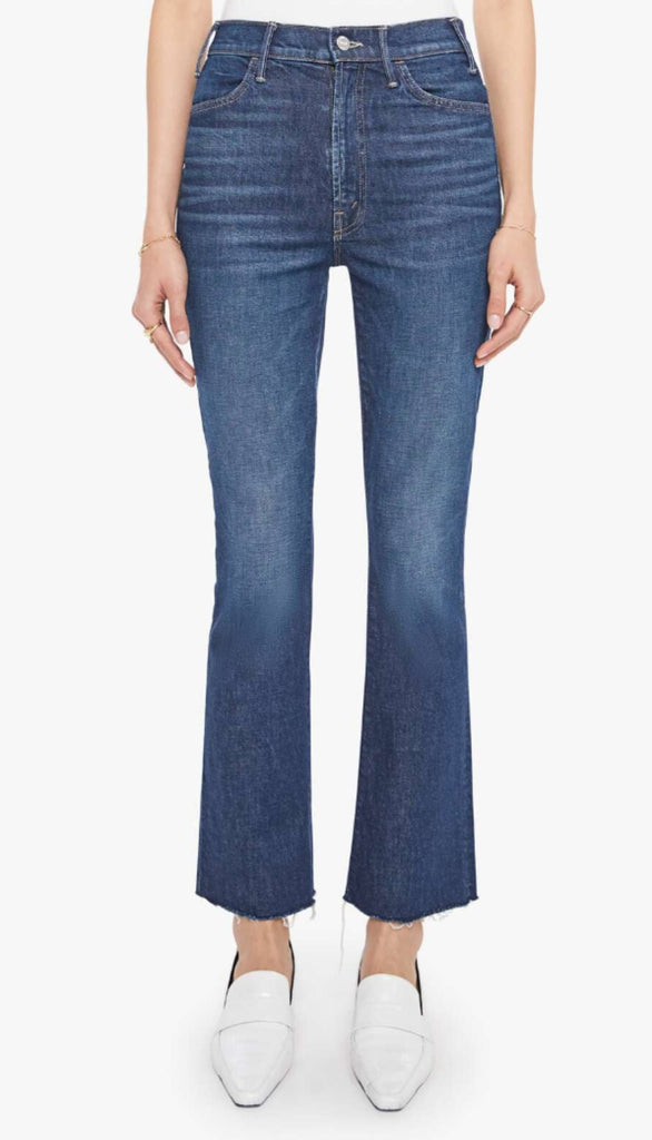 Amped up. This high-rise flare has a zip fly, 28.25-inch inseam and a frayed hem. Made from semi-rigid SUPERIOR denim, Kicks And Riffs is a dark blue with subtle fading and whiskering.