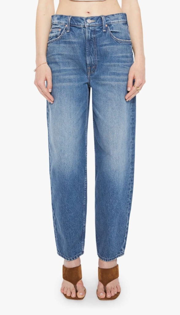 A blast from the past. Super high-waisted barrel-leg jeans with a zip fly, ankle-length inseam and a clean hem. Made from rigid SUPERIOR denim, Remember When is a mid-blue with whiskering and fading at the knees.