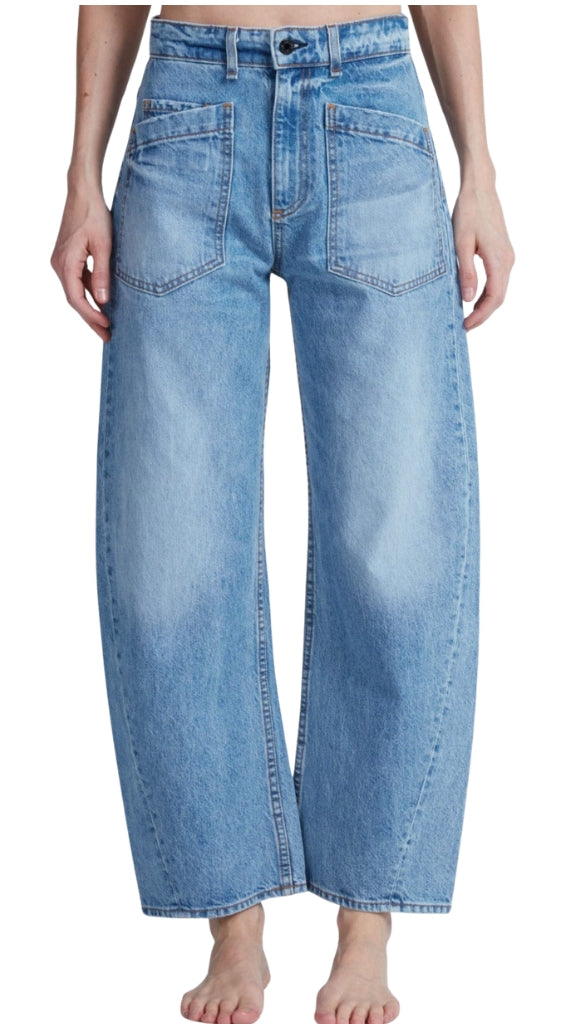 A signature barrel leg with a twist—literally. The Twisted Barrel is designed with a barrel curve that creates a subtly sculpted shape from hip to hem. It sits high on the waist with a relaxed leg and cropped inseam for a modern silhouette that looks effortless.