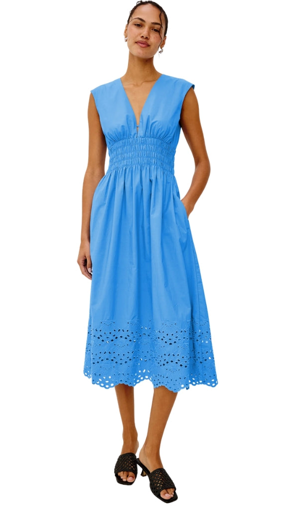 The Roxanne is a lightweight cotton midi dress with shirred shoulders, a plunging V-neckline, a smocked waist, and delicate seashell embroidery along the hem.