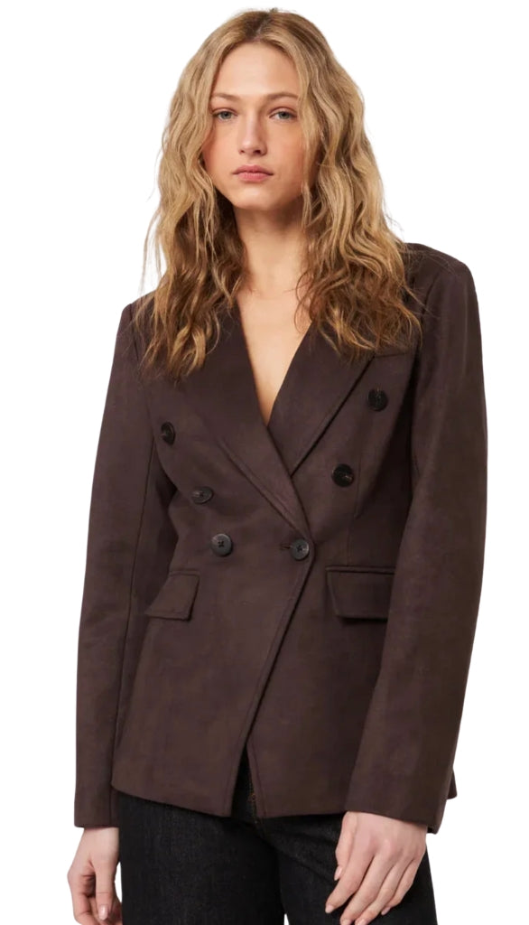 The Orson Blazer is crafted in a rich dark brown faux suede, bringing sophistication and versatility to your wardrobe. Perfectly polished for the office yet effortlessly chic for a night out.