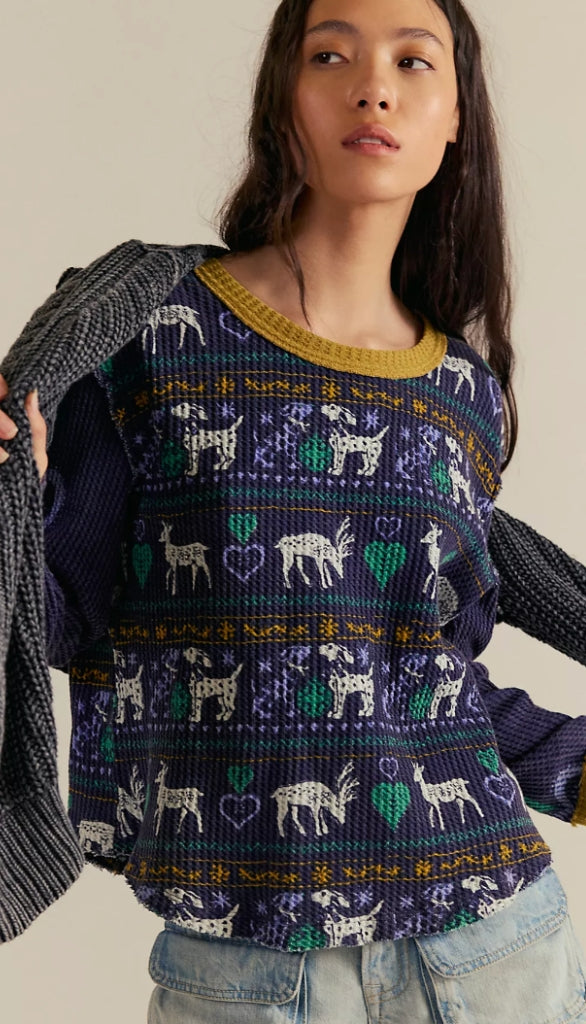 Perfect in print from our We The Free collection, this long-sleeve features a waffle-knit fabrication and relaxed fit with a scoop-neckline and contrast trim.