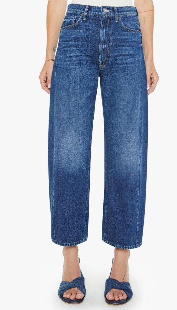 High hopes. A super high-waisted jean with a wide, curved leg, an ankle-length inseam and a clean hem. Made from SUPERIOR denim, Did You Bring Me Anything? is a dark blue wash with whiskering and fading at the knees.