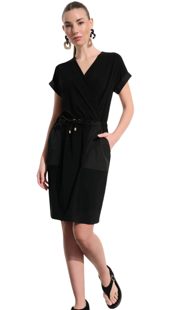 Effortless elegance meets everyday practicality in this Joseph Ribkoff wrap dress. The silky knit fabric drapes beautifully while the memory material at the drawstring waist ensures a flattering fit that moves with you. Distinctive dolman sleeves with sporty cuffs add contemporary flair, while functional kangaroo pockets provide convenient storage. Gold-accented eyelets and tips elevate the waist detail, creating a polished finish on this versatile straight-cut silhouette perfect for transitioning from casual outings to relaxed social occasions.