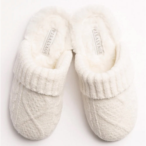 Unwind in style with our chenille cable slippers. These mule slippers, with a faux fur-lined footbed and molded lug sole bottom, provide exceptional comfort and style. The elegant knit enhances their cozy appeal, making them a luxurious choice for relaxing at home this season and next.